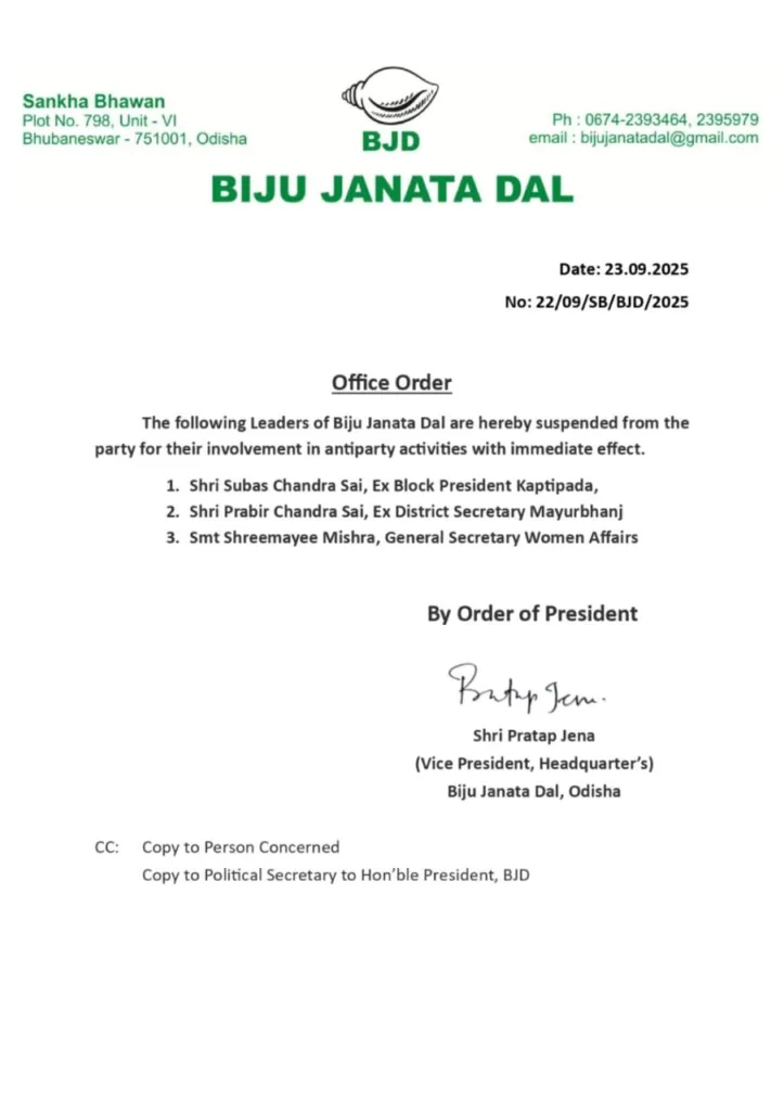 ମାଆକୁ ସମ୍ମାନର ଆହ୍ବାନ ଦେଉଥିବା ଜଣେ ଜନନାୟକଙ୍କର ଦାୟାଦ ଯେ ନିଜେ ନିଷ୍ପତ୍ତି ନେବାରେ ସକ୍ଷମ ନୁହଁ, ଆଜି ପ୍ରମାଣିତ କରିଦେଲେ। ମୁଁ ଓଡିଆ ଝିଅ ବୋଲି ପ୍ରମାଣିତ କରିବା ପାଇଁ ଆତ୍ମଗାରିମାକୁ ଜଳାଞ୍ଜଳି ଦେବା ଆଦୌ ଉଚିତ ମନେ କରୁନାହିଁ । ଶ୍ରୀମୟୀଙ୍କ ବ୍ୟତୀତ କପ୍ତିପଦା ବ୍ଲକର ପୂର୍ବତନ ସଭାପତି ସୁବାସ ଚନ୍ଦ୍ର ସାଇ ଏବଂ ମୟୂରଭଞ୍ଜର ପୂର୍ବତନ ଜିଲ୍ଲା ସମ୍ପାଦକ ପ୍ରବୀର ଚନ୍ଦ୍ର ସ୍ୱାଇଁଙ୍କୁ ମଧ୍ୟ ବିଜେଡିରୁ ନିଲମ୍ବିତ କରାଯାଇଥିବା ବିବୃତିରେ ସୂଚନା ଦିଆଯାଇଛି।